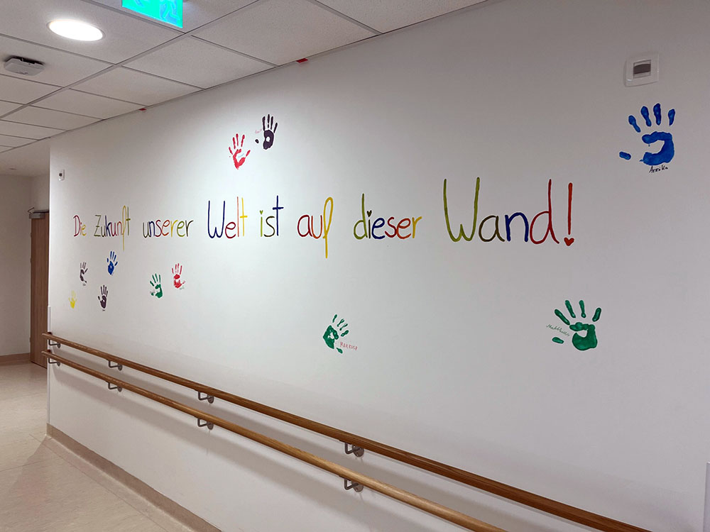 Im OptimaMed Rehabilitationszentrum für Kinder und Jugendliche Wiesing entsteht derzeit eine neue kunstvolle Wand. Die Ergotherapeutin Elisa organisiert aktuell ein neues Projekt – nämlich eine Wand voller Handabdrücke. Auf der kunterbunten Wand können sich die Kinder sowie Jugendlichen am Ende des Aufenthaltes mit Handabdruck verewigen. Unter den Handabdrücken wird selbstverständlich mit bunten Farben unterschrieben. Die Mitarbeiter:innen sowie Patientinnen und Patienten laufen jedes Mal mit einem Schmunzeln an der kunstvollen Wand vorbei und halten das Projekt für eine großartige Idee. Die farbenfrohe Wand schmückt ab sofort das Rehabilitationszentnrum und sorgt immer wieder für strahlende Augen.