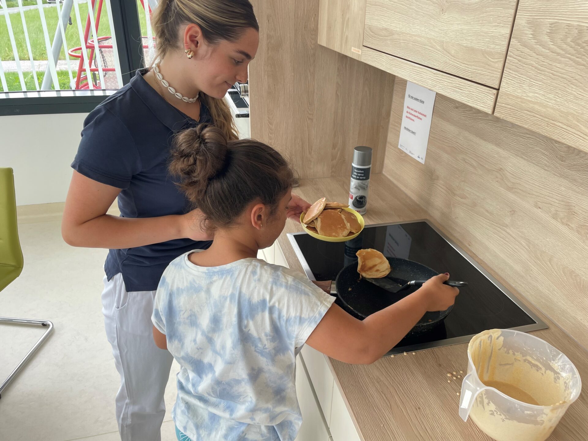 Deshalb zauberten die Patientinnen und Patienten kürzlich köstliche Pancakes in der Lehrküche. Mit viel Begeisterung lernten die Kinder Schritt für Schritt, wie man aus wenigen Zutaten fluffige Pancakes zubereitet. Der fertige Frühstücksklassiker wurde dann noch mit frischem Obst sowie Ahornsirup verfeinert und konnte anschließend in vollen Zügen genossen werden.