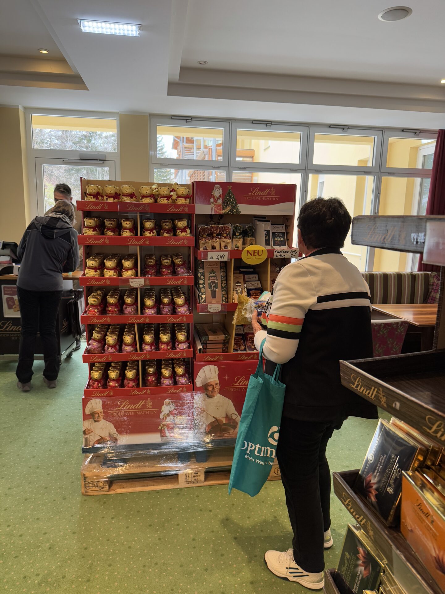 Kürzlich war, wie auch in den vergangenen Jahren, der Lindt-Weihnachtstruck im OptimaMed Rehabilitationszentrum Raxblick. Draußen hat es schön geschneit, daher wurde der Verkauf in das Innere des Hauses verlegt. Patientinnen und Patienten sowie Mitarbeiter:innen hatten über die Mittagszeit die Möglichkeit, viele Produkte köstliche Schokoladeprodukte und weihachtliche Editionen zum Vorteilspreis zu erwerben. Der Verkauf fand regen Anklang und es wurde auch gleich ein wenig genascht. 😉