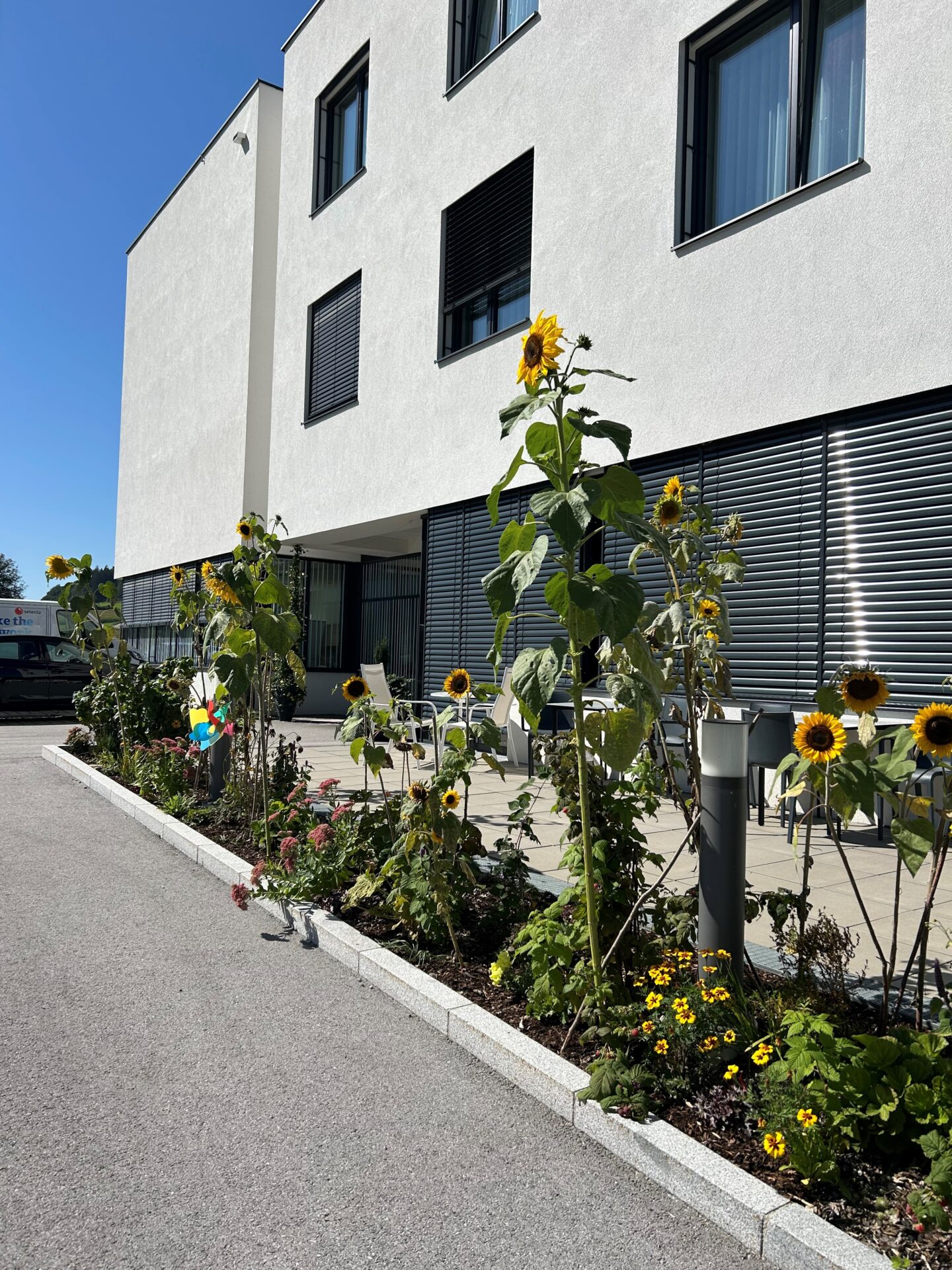 Der September zeigt sich noch einmal von seiner freundlichen Seite – und der Eingangsgarten des OptimaMed Rehabilitationszentrum für Kinder und Jugendliche Wiesing macht mit. Große Sonnenblumen recken sich in die Herbstsonne, dazwischen blühen bunte Spätblüher in kräftigen Farben. Überall summt es noch ein wenig und an vielen Ecken können unsere kleinen Gäste sogar reife Himbeeren entdecken und naschen.